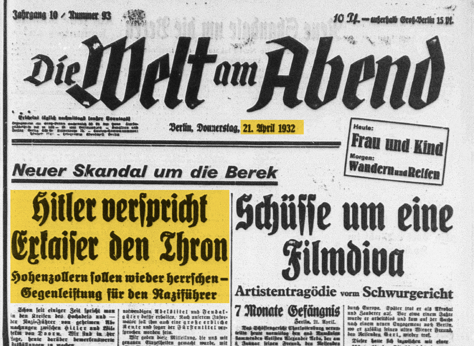 Titelblatt Welt am Abend vom 21. April 1932